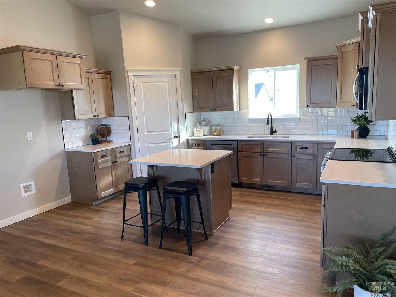 Welcome to this beautifully designed single-level home offering the perfect blend of comfort and functionality. With 1,604 square feet of thoughtfully planned living space, this residence features an inviting open-concept layout ideal for everyday living. Step into a spacious kitchen with a large center island, quartz countertops, tile backsplash, and stainless steel appliances. The vaulted ceilings and recessed lighting create an airy, modern feel throughout the main living area. The primary suite includes a walk-in shower, separate soaking tub, and dual-sink vanity for added convenience. Additional highlights include durable LVP flooring, a full landscape package, and a fully fenced backyard ready for outdoor enjoyment.